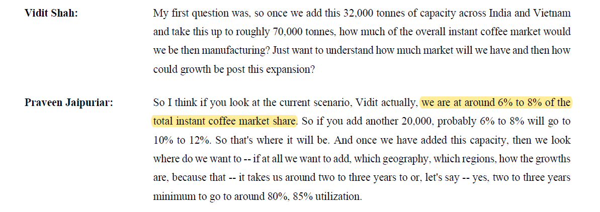 Current existing capacity of Continental Coffee is 37,500 tonnes per day, the company is going to add 16,000 tonnes in CY23 and in CY 2024 another 16,000 tonnes will be added, which will essentially double the capacity