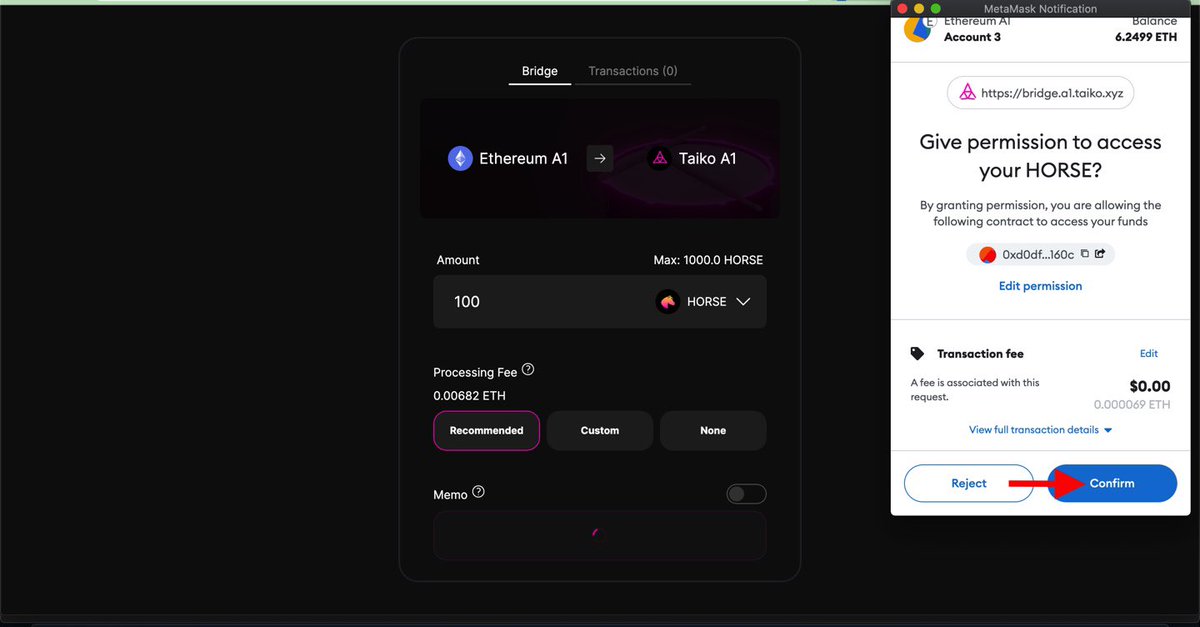 Now Visit bridge.a1.taiko.xyz, & Connect Wallet, Switch Token To HORSE & Click Faucet, Then Click Mint & Confirm Transaction In MetaMask, You Should Get A Success Message & 1000 $HORSE Should Be Available In Your Wallet