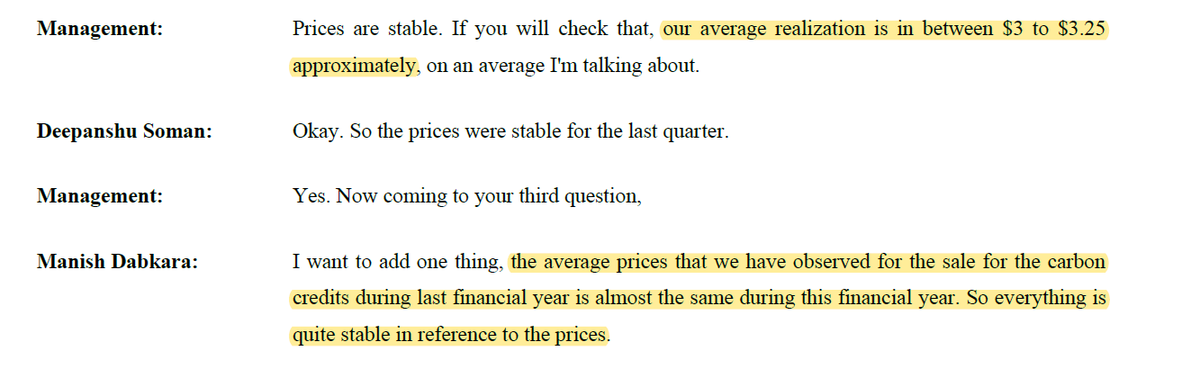 The price of carbon credit is stable and is expected to grow in the future, Currently the company gets between 3 to 3.25 dollars for a carbon credit