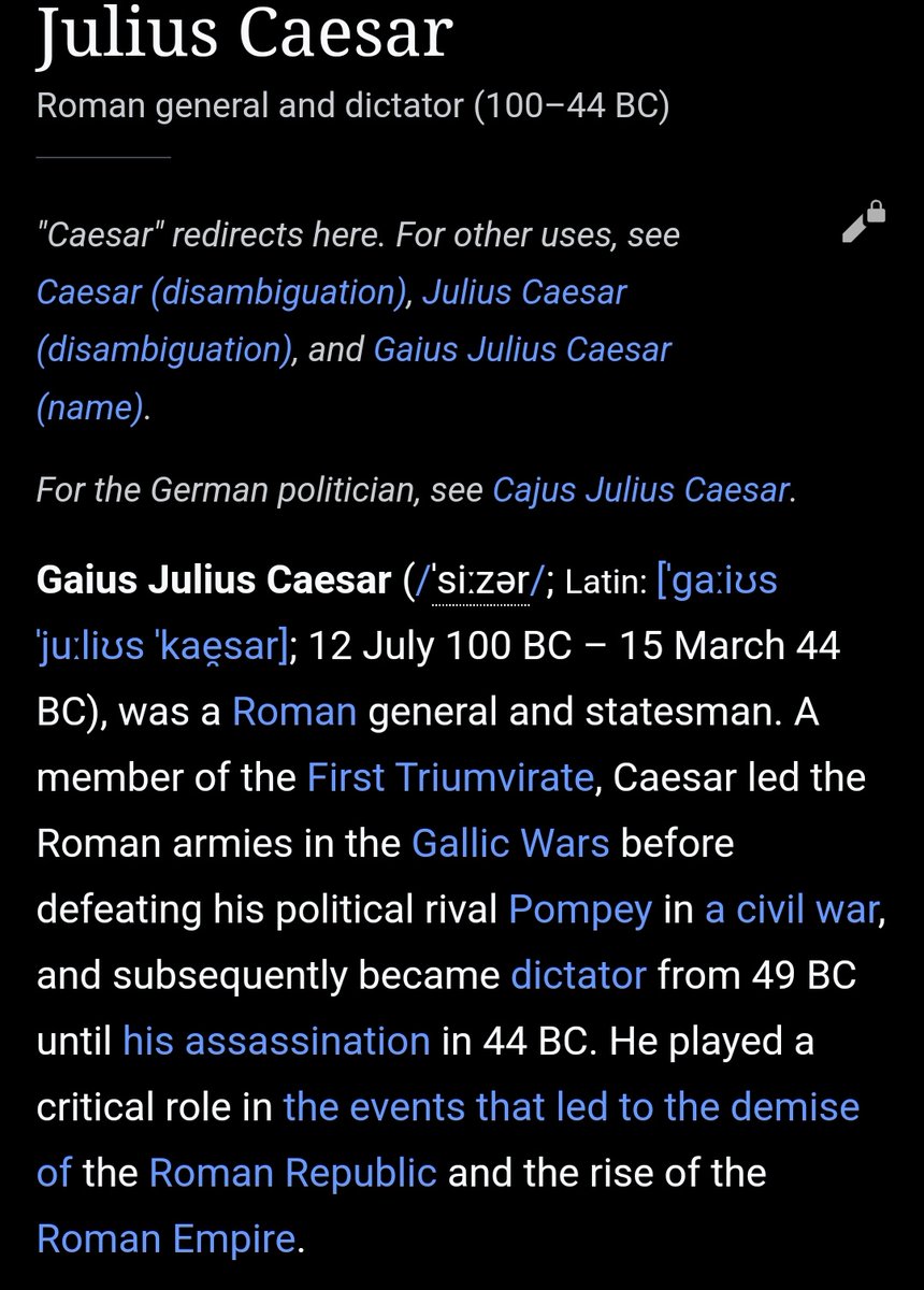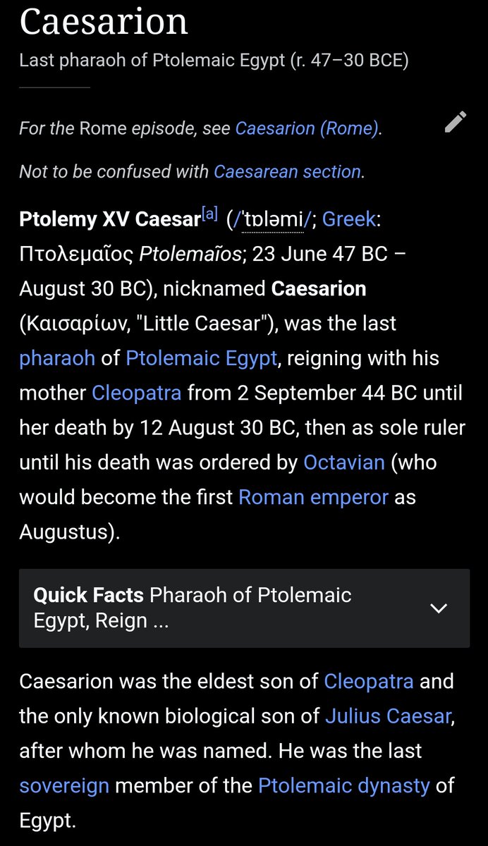 I'll start with documented history. Ptolemy XV was born in 47 BCE to Greco-Egyptian Pharoah Cleopatra and Roman dictator Julius Caesar. After the assassination of Julius, Cleopatra had an affair with one of Caesar's commanders, Mark Antony, with whom she had 3 other children....