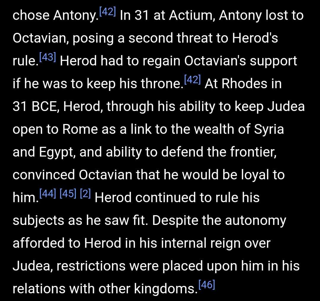 Later, during the power struggle between Mark Antony & Octavian, Herod sides with his friends Mark Antony & Cleopatra. After the defeat of Mark Antony by Octavian, Herod seeks to gain the trust of Octavian & remain as king of Judea. So he pledges eternal loyalty to Octavian