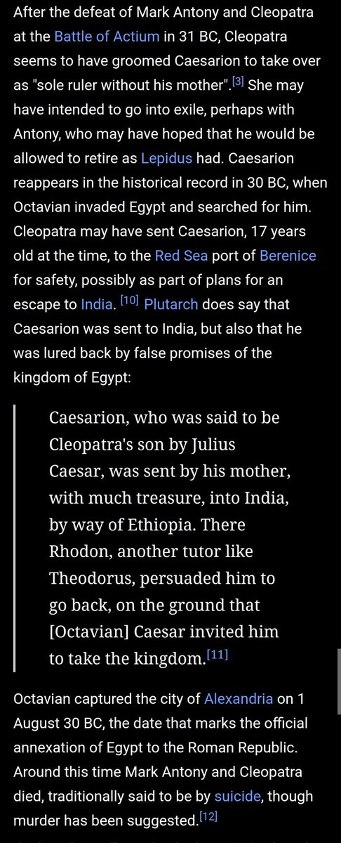 and placed in the care of Octavian's sister Octavian the younger, who also happened to be the wife of Mark Antony. Before her death, Cleopatra sends her son Ptolemy XV, along with his guardians to Kush & eventually to India. Octavian, declares himself heir to Julius Caesar....