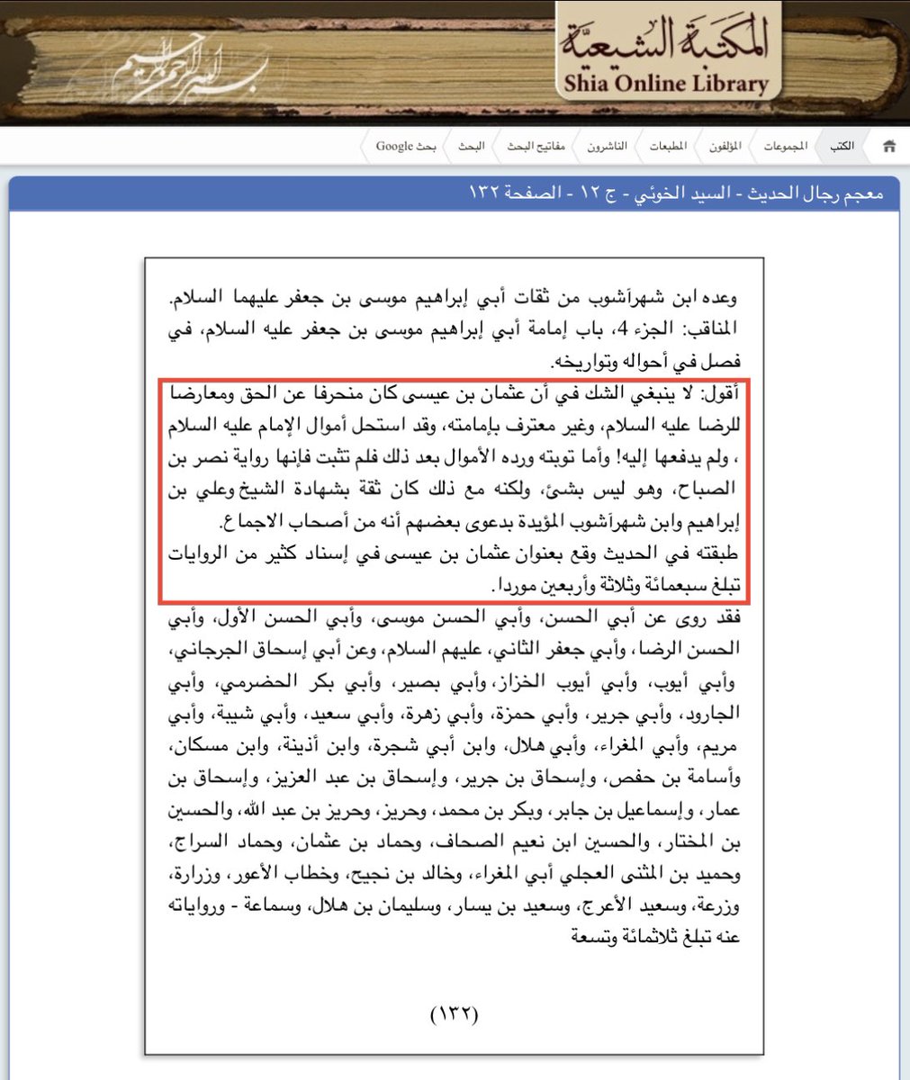 Al-Khoei said about this individual:"There must be no doubt that ‘Uthman Ibn Issa was misguided from the truth and was an opponent to Imam a-Rida (peace be upon him), and he never accepted his imamah, and he stole the money of the imam and did not return it to him! […]