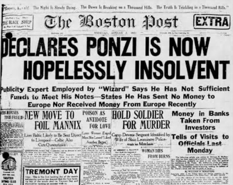 6/ The scheme came crashing down in 1920 when a Boston newspaper published an exposé revealing that Ponzi was not actually making any money from arbitraging postal coupons. The headline read "Ponzi's Million Dollar Coupon Business Proves a Mirage”