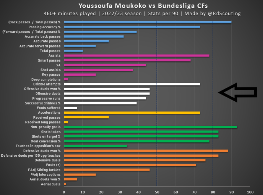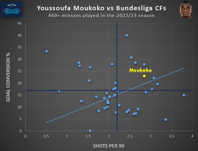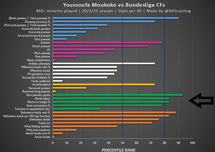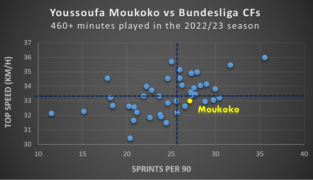 In general, Moukoko feels the most comfortable with his left-foot, especially in ball-striking, so is better on the right rather than the left side.