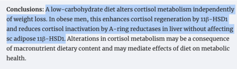 Cortisol is associated with almost every health issue. The short term "benefits" you think you're getting from low carb are coming at a very high long term cost.