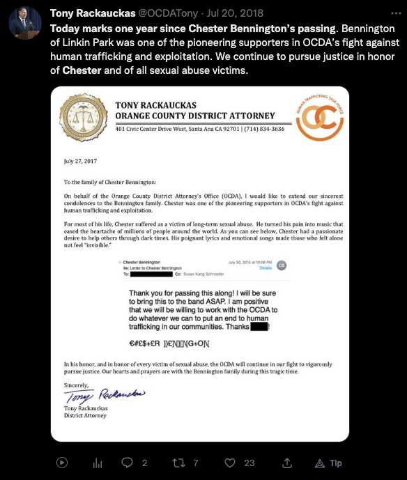 Look at this tweet. Why have you NEVER heard of Chester Bennington's grassroots efforts to combat human trafficking at a local level? As much as "The Silent Children" was so sensational, why not this? WHY???