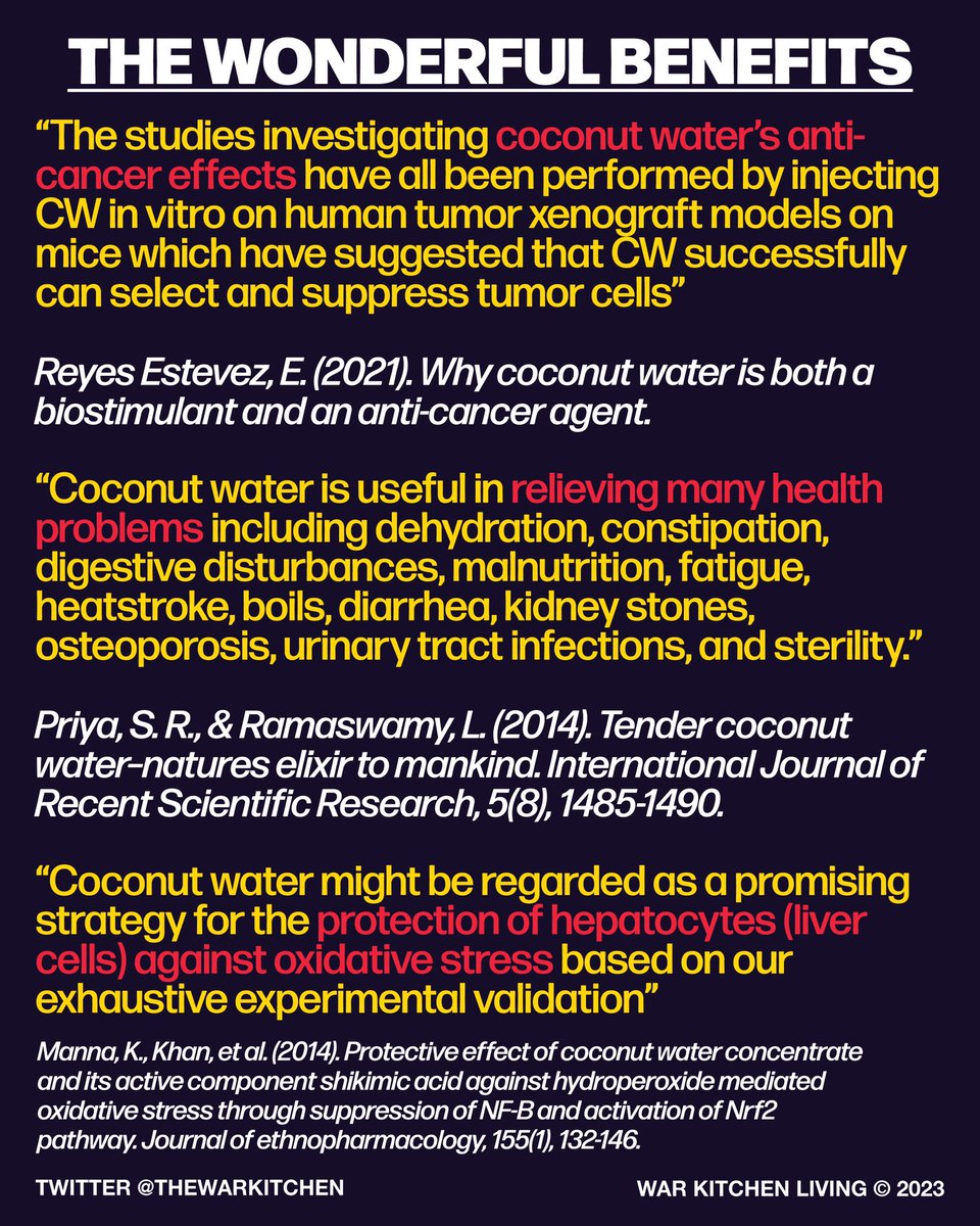 More research needs to be done on the various types of Cytokines present in coconut water like Kinetin, which show promising signs for reversing diseases including the likes of cancer