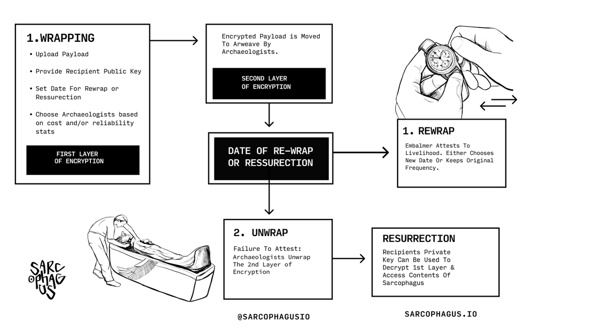 The user encrypts their data (including a recipient) through a dApp, creates a smart contract that sets a expiration date on the data's release, wraps the data in another layer of encryption, and sends it to a third party to store it permanently on Arweave.