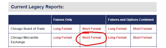 Use the „Chicago Mercantile Exchange“ report short format futures only for currencies: