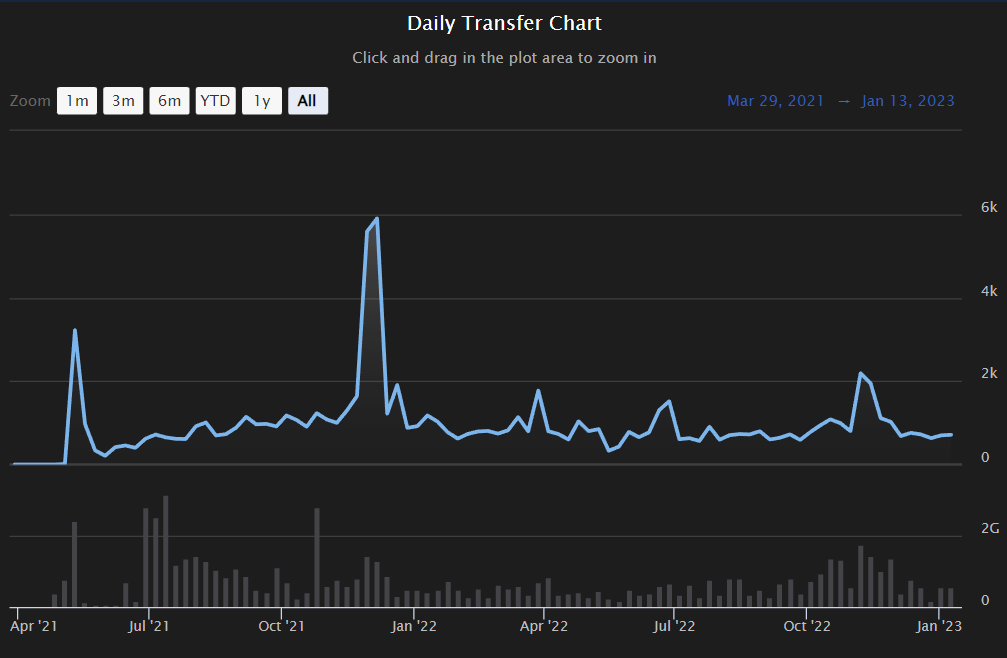 4- استخدام البلوكتشين حتى الآن ما زال ضعيفًا، فمتوسط المعاملات اليومية على حاليًا أقل من 1000 معاملة، وهذا سببه الرئيسي أن المشروع ما زال تحت التطوير، والشركات التي تعمل مع Casper لم تبدأ حتى الآن في استخدام البلوكتشين للسبب الذي ذكرته في النقطة رقم 1.