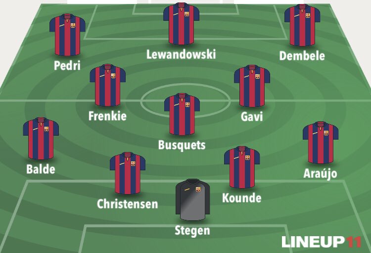 With the ball we play with a back three. Balde pushes forward and becomes an extra midfielder/winger. Busquets & Frenkie in a double pivot (which gives Frenkie more freedom to be creative as Busquets covers for him). Pedri & Gavi in the space between their midfield and defense.