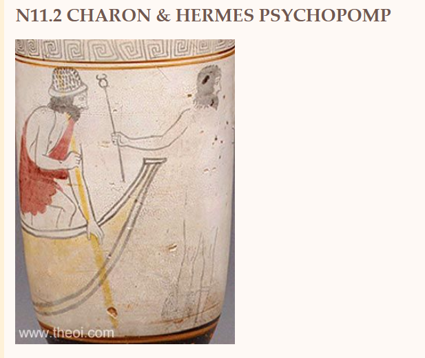 Bu noktada yaşlı kayıkçı Charon (Acheron) onları yeraltı dünyasının kapılarına götürdü. Hades'e. Çünkü Dünya Tarih Ansiklopedisi'nin bildirdiğine göre, "Psychopompos" yani ruh taşıyıcı Hermes "ruhları" sadece