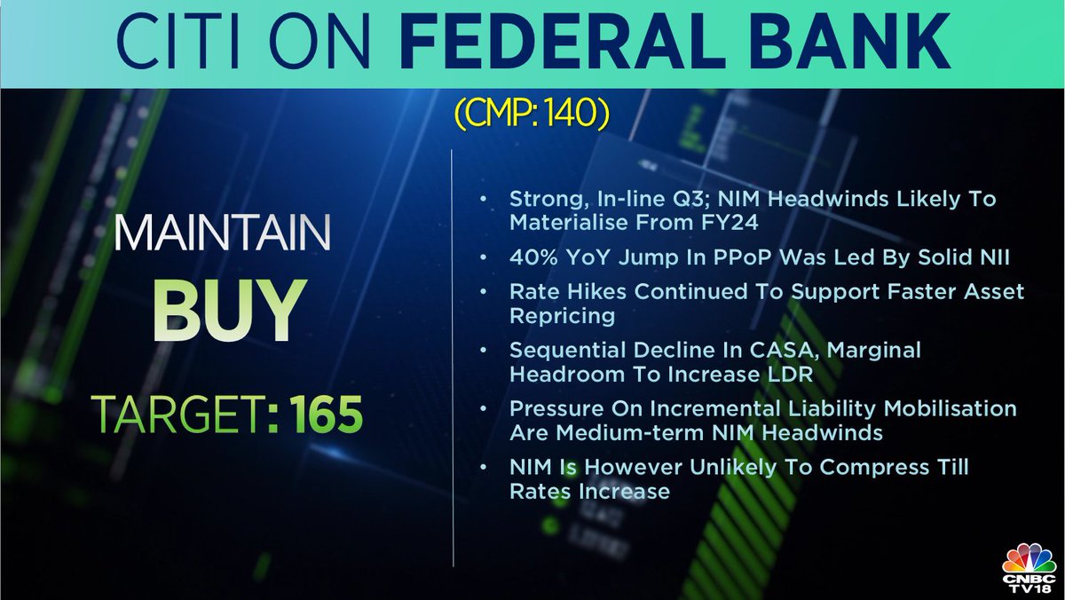 #CNBCTV18Market | Citi gives buy call on Federal Bank, raises target to Rs 165/sh, says strong, in-line Q3; NIM headwinds likely to materialise from FY24