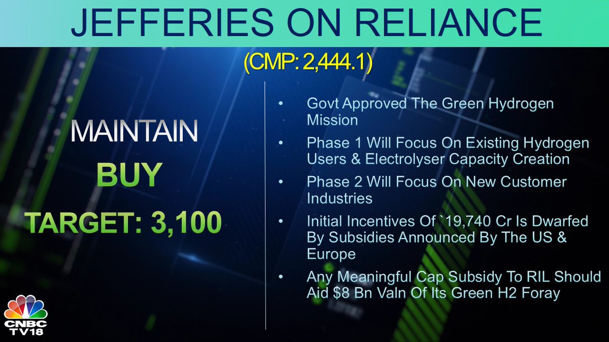 #CNBCTV18Market | Jefferies gives a buy rating on Reliance, says govt approved the Green Hydrogen Mission. Phase 1 will focus on existing hydrogen users & electrolyser capacity creation. Phase 2 will focus on new customer industries