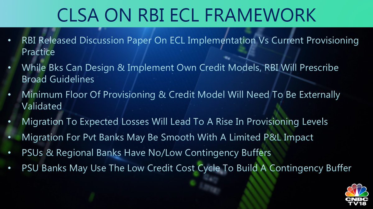 #CNBCTV18Market | CLSA says pvt bks have high levels of NPA coverage & contingency buffers which should make the migration to ECL smooth with a limited P&L impact. PSUs have no/low contingency buffers but they may use low credit cost cycle currently to build a contingency buffer