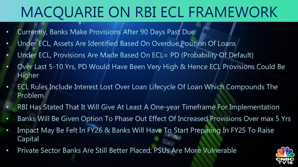 #CNBCTV18Market | Macquarie believes impact of migration to ECL may be felt in FY26 accounts and banks will have to start preparing in FY25 to raise capital. It adds, private sector banks are better placed than PSUs for ECL provisioning