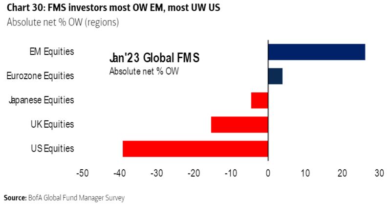 Europe and emergining markets are being bought instead. A complete 180 from the scenario from mid 2021 when every news outlet was bragging about how strong the US economy was.