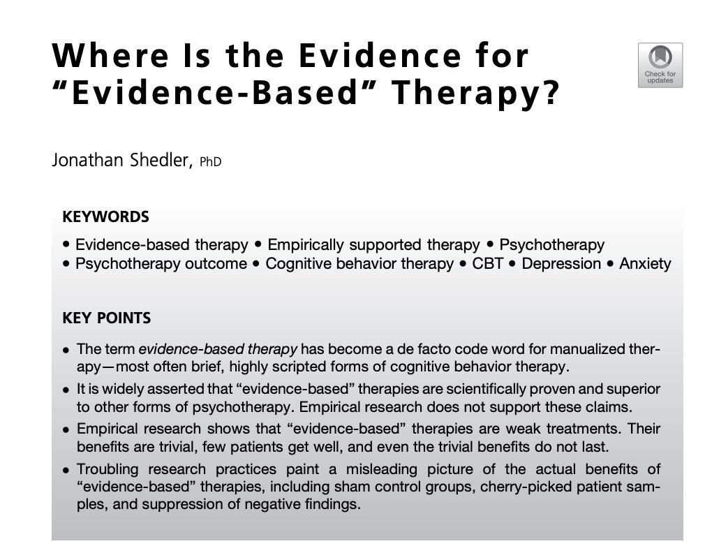 2/ This is the biggest hoax perpetrated on the public by academic psychology/psychiatry. All available evidence from randomized controlled trials (RCTs) shows that *all legit/mainstream forms of psychotherapy have equivalent outcomes*