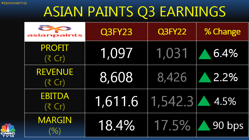 #3QWithCNBCTV18 | Asian Paints (@asianpaints) reports Q3 earnings.