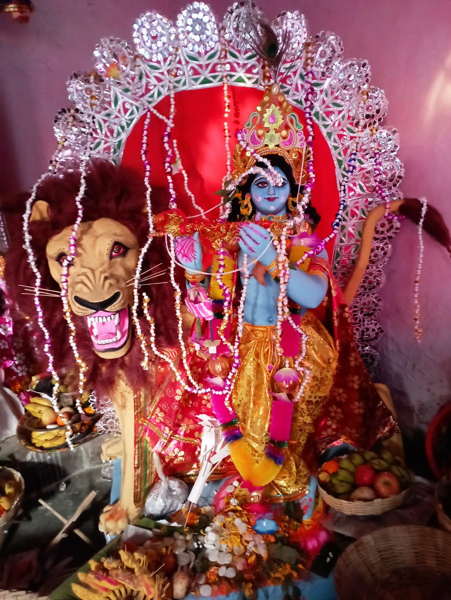 Thakur Sonaray - Krishna riding Lion : On the day of Magh Krishna Ekadasi, in Varendra region (mid-north Bengal) Sri Krishna is worshiped in a special form, Simhavāhana Banśīdhārī Kr̥ṣṇa, known as Thakur Sonaray. This form is comparable to Dharma-thakur Bankura Ray of Rarh.