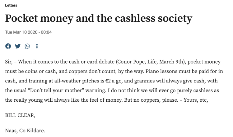 18. "The pandemic has made Ireland -- and every other country -- into largely cashless societies. From Apple Pay on your watch to Revolut on your phone, cash has faded away in daily life"