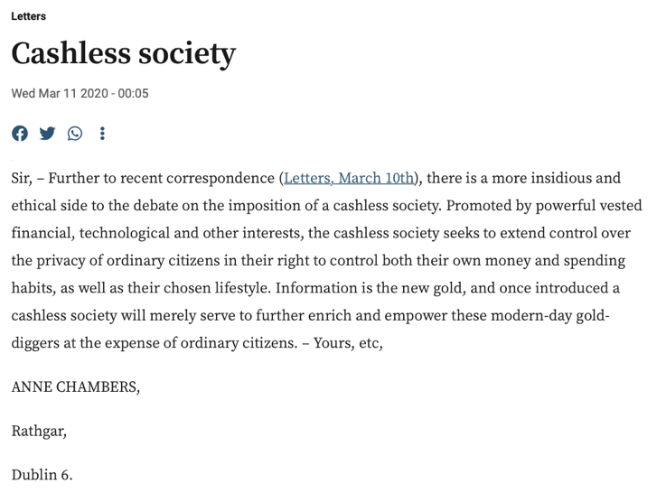 2. Since Covid kicked off in March 2020, the drive to going cashless has been relentlessly pushed by the media, especially by Irelandās state propaganda broadcaster RTE, The Irish Times (IT) and The Independent. This isnāt just an Irish or UK issue but is happening globally.