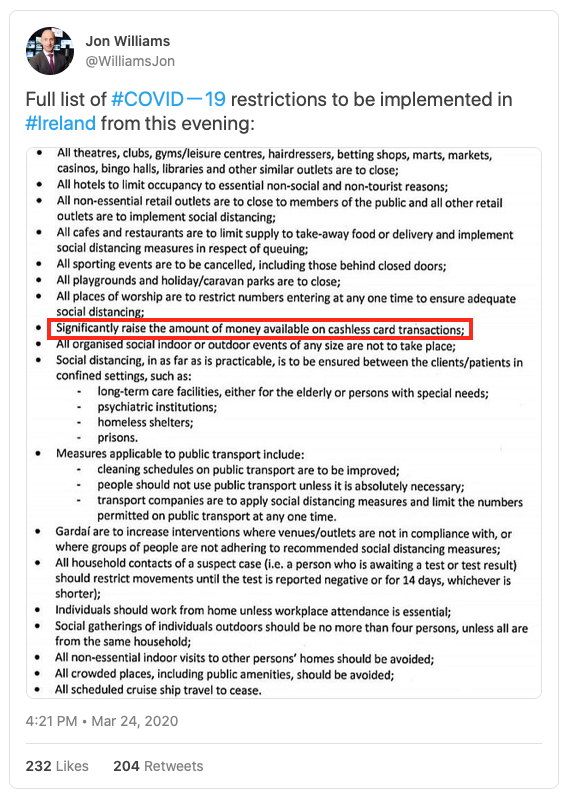 17..mentioning it on the Late Late Show as well. Irelandās most watched TV show was taking advantage of covid to get us to switch to a contactless cashless society.