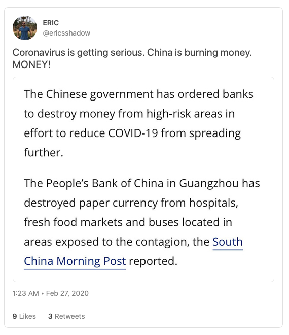 13. You might have forgotten the propaganda coming out of China as well back in March 2020. Apart from people falling down and dying in the streets, the Chinese were burning money because of the potential spread of Covid.