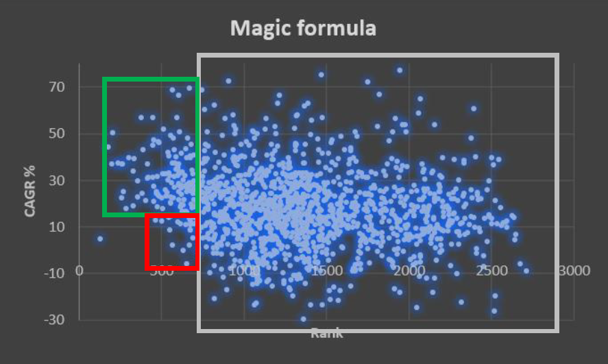 Though I see some of the low-ranking stocks giving 40%+ CAGR also in above plot, I will only focus on the ones with better ranking.