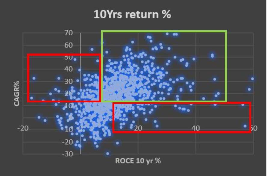 But letโs face it, we are creating these plots in Hindsight and Estimating future ROCE and returns are next to impossible so a value investor takes a great amount of margin of safety. Thus our end goal is to reduce the Red highlighted portion (loses) close to zero. 15/n