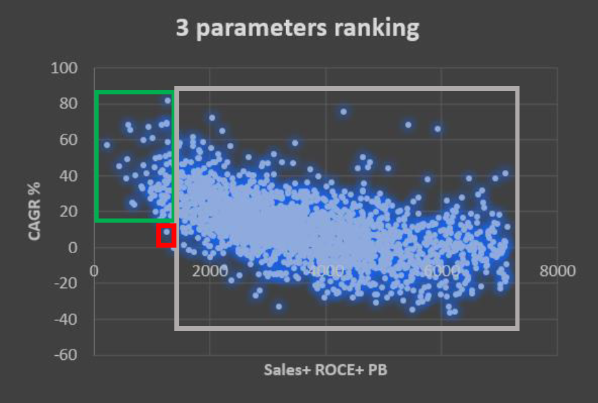 I did such 40-50 combinations where I put 4 growth parameters with 3 quality and 4 Valuation parameters (shown in start of thread) in pair of 2s and then 3s to get better picture.