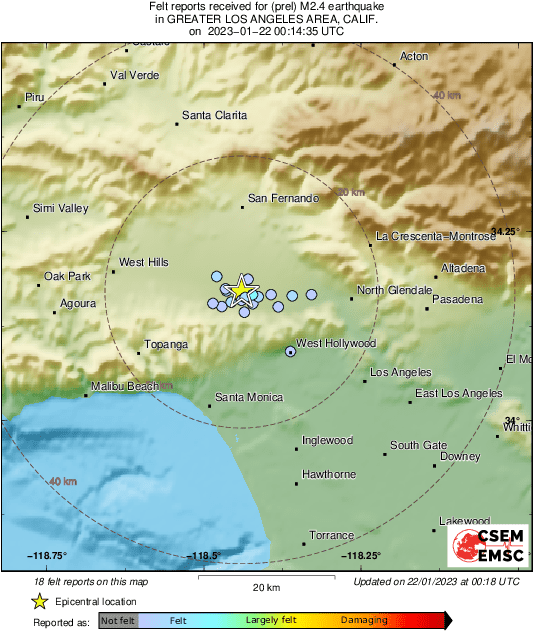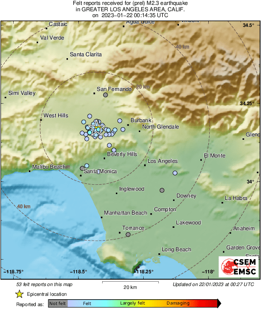 #Earthquake 13 mi NW of Los Angeles (#California) 14 min ago (local time 16:14:35). Updated map - Colored dots represent local shaking & damage level reported by eyewitnesses. Share your experience: