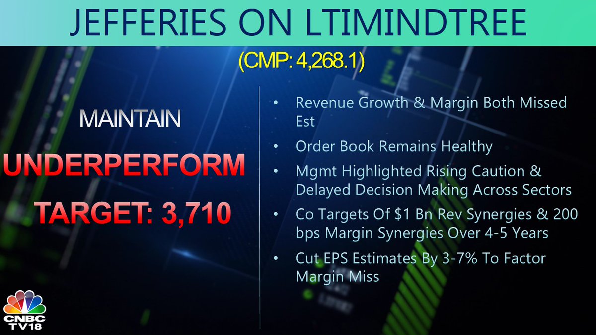 #CNBCTV18Market | Revenue growth & margin both missed est. Order book remains healthy. Mgmt highlighted rising caution & delayed decision making across sectors, says Jefferies on LTIMindtree