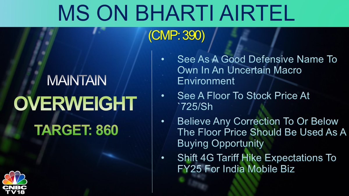 #CNBCTV18Market | MS gives an overweight rating on Bharti Airtel, says see as a good defensive name to own in an uncertain macro environment. See a floor to stock price at Rs 725/sh. Believe any correction to or below the floor price should be used as a buying opportunity
