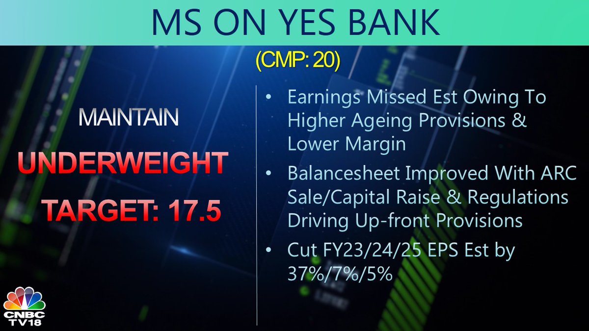 #CNBCTV18Market | MS gives an underweight rating on Yes Bank, says earnings missed est owing to higher ageing provisions & lower margin. Balancesheet improved with arc sale/capital raise & regulations driving up-front provisions
