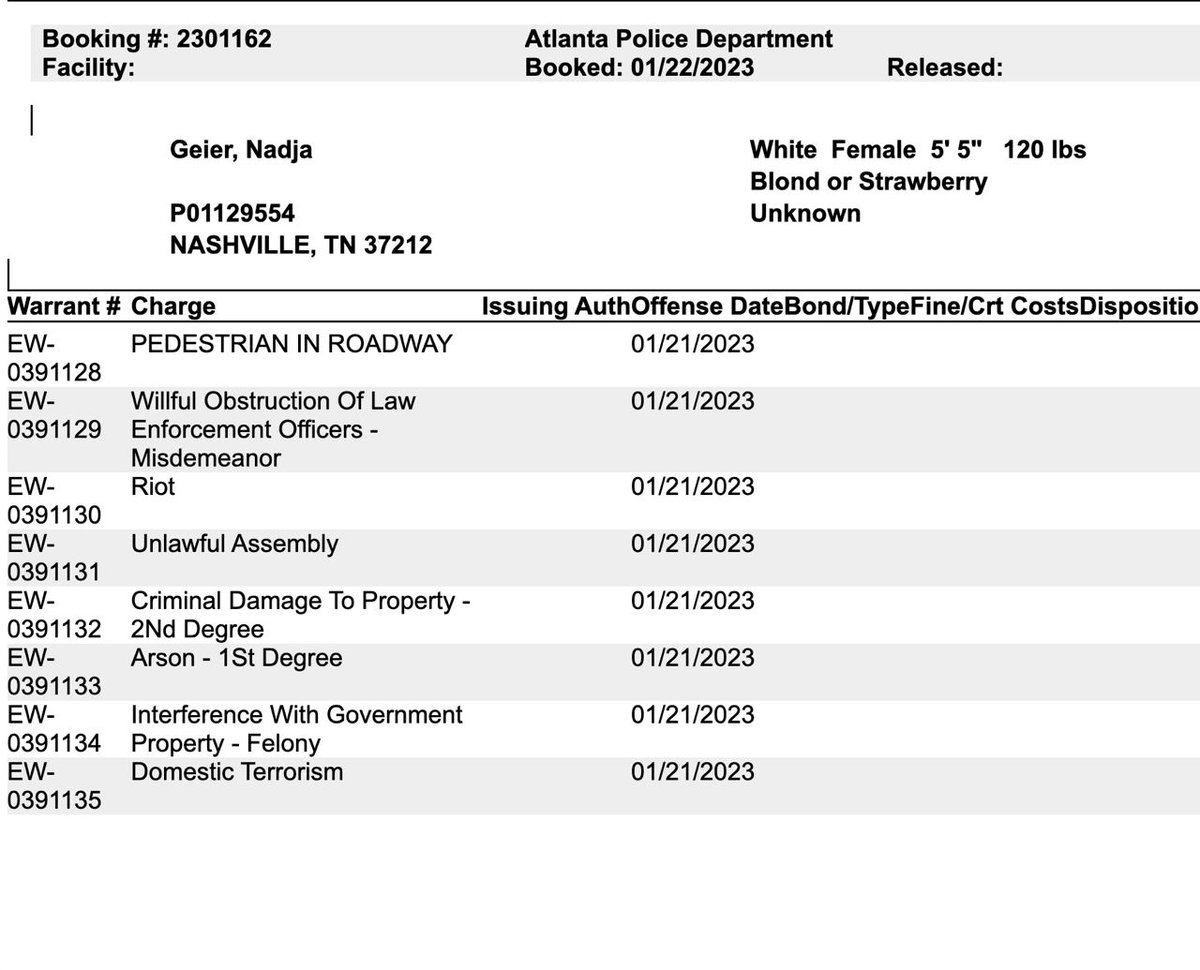 #Atlanta terror suspect Nadja M. Geier (born Oct. 31, 1998) has a last known address in Nashville, with possible prior origin from Germany. She is dating fellow terrorism arrestee, Ivan J. Ferguson. #Antifa #AtlantaAutonomousZone nypost.com