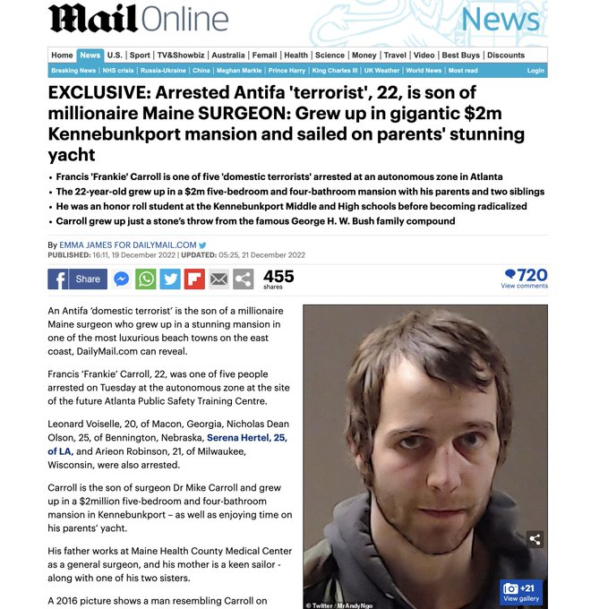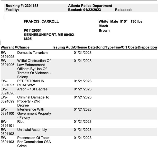 Francis Carroll (b. 5-9-00) came from Kennebunkport, ME, to allegedly commit domestic terrorist acts in Atlanta. After being bailed out for domestic terrorism last month, he allegedly carried out another terror attack. He's been denied bail. #StopCopCity nypost.com