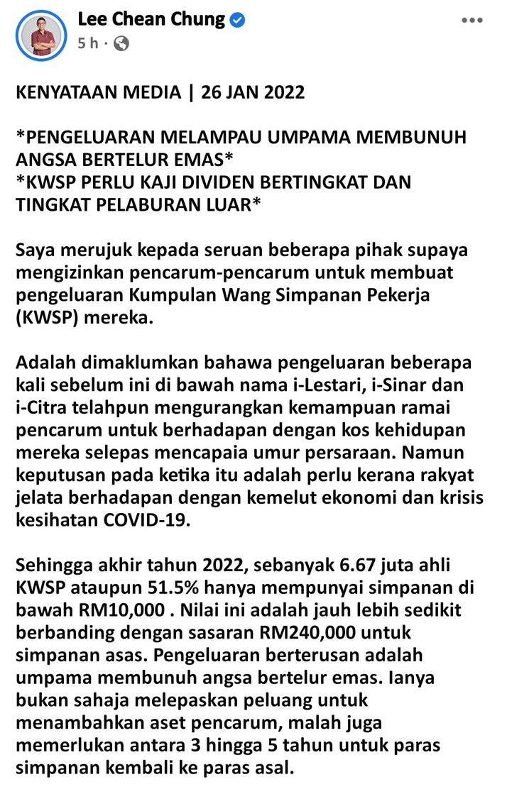 4. Lee also suggests increasing foreign investments by EPF and limiting withdrawals after the age of 55.