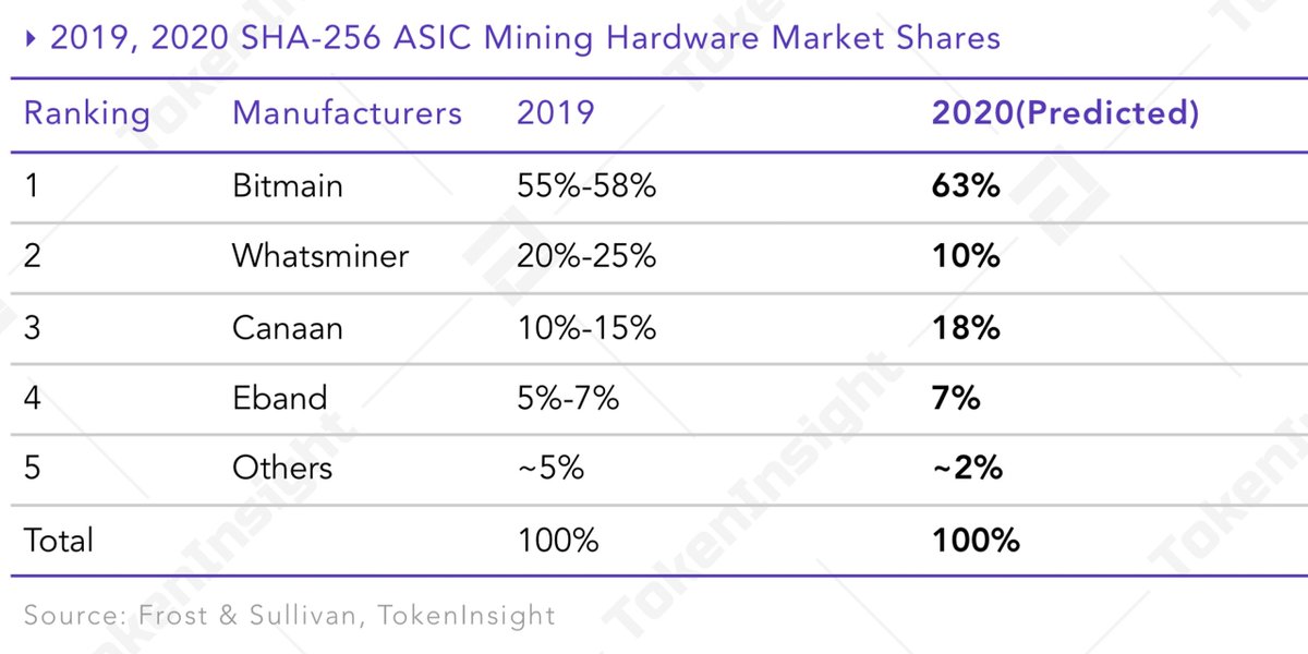 حسب آخر تقرير استطعت الوصول إليه حول حصص الشركات المصنّعة لأجهزة ASICs كان يوضح أن شركة Bitmain تسيطر على أكثر من 55% من السوق في 2019، وتوقع ارتفاع هذه النسبة إلى 63% في 2020.