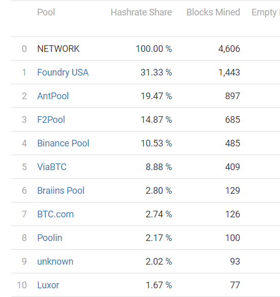 لترى مدى مركزية تعدين البتكوين يمكنك أن تنظر إلى أكبر حوض Foundry USA وهو مملوك لشركة Digital Currency Group (DCG) التي تملك أيضًا شركة Genesis المفلسة، وحوض Antpool المملوك لشركة Bitmain التي هي أيضًا أكبر منتج لأجهزة تعدين البتكوين. هل تلاحظ نمط ما؟