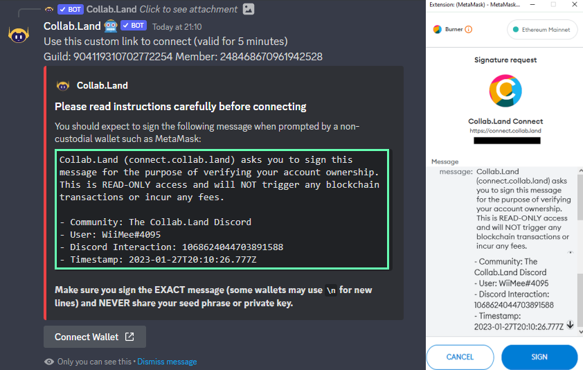 Your Discord ID will be linked to the wallet address, and can be used without further signing.