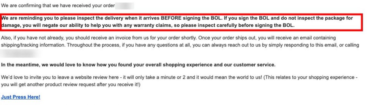 The only time I lost a large chunk of money from shipping damages on a suppliers account is because a customer signed for delivery of a damaged product thinking the warranty would cover it.