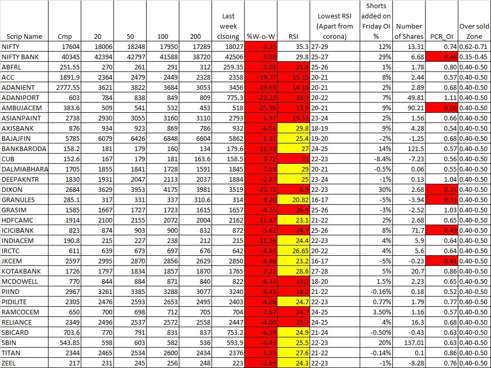 1). #AMBUJACEM:- Stock has corrected 25% W-o-W; 14 day RSI at 13 (touched low of 10.78); lowest level (below corona level) – crucial lows of 347-350, buy dips till 330 holds, above 400 can lead to first round of short covering till 440-445.