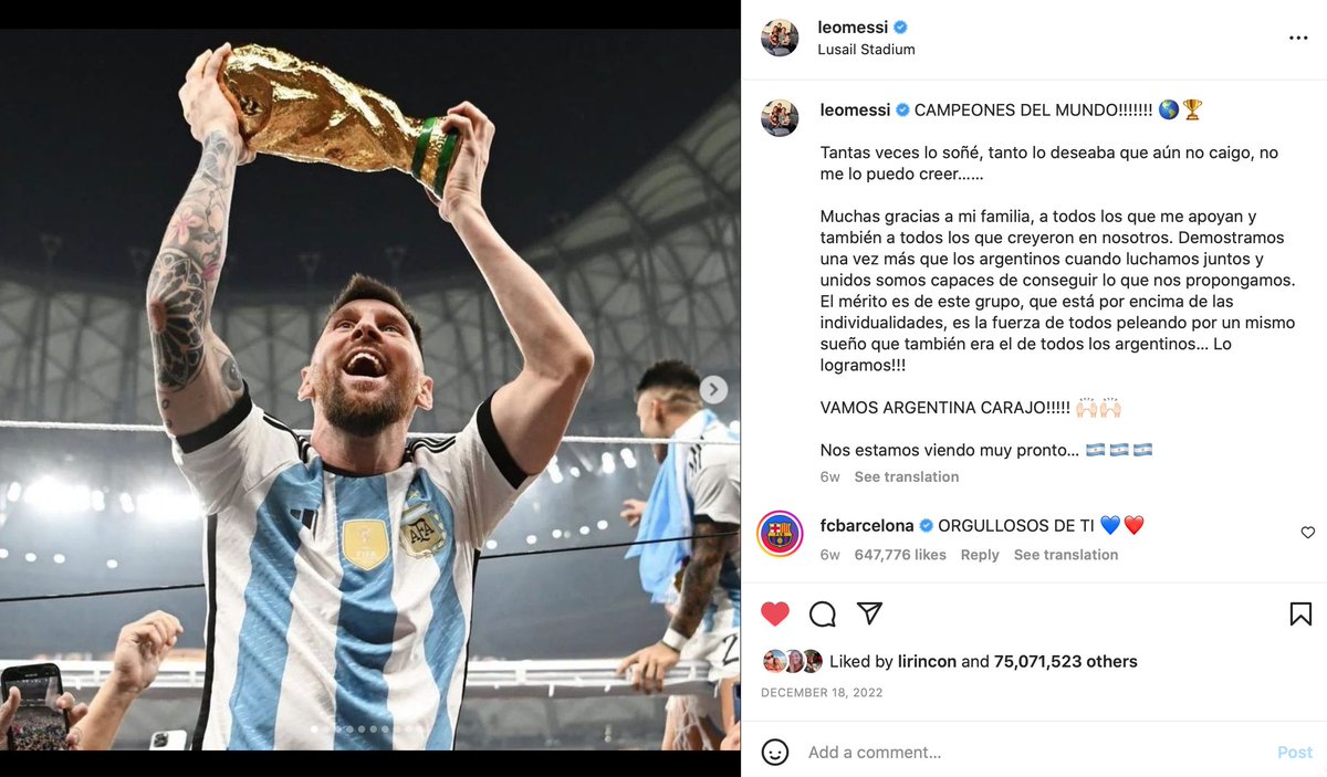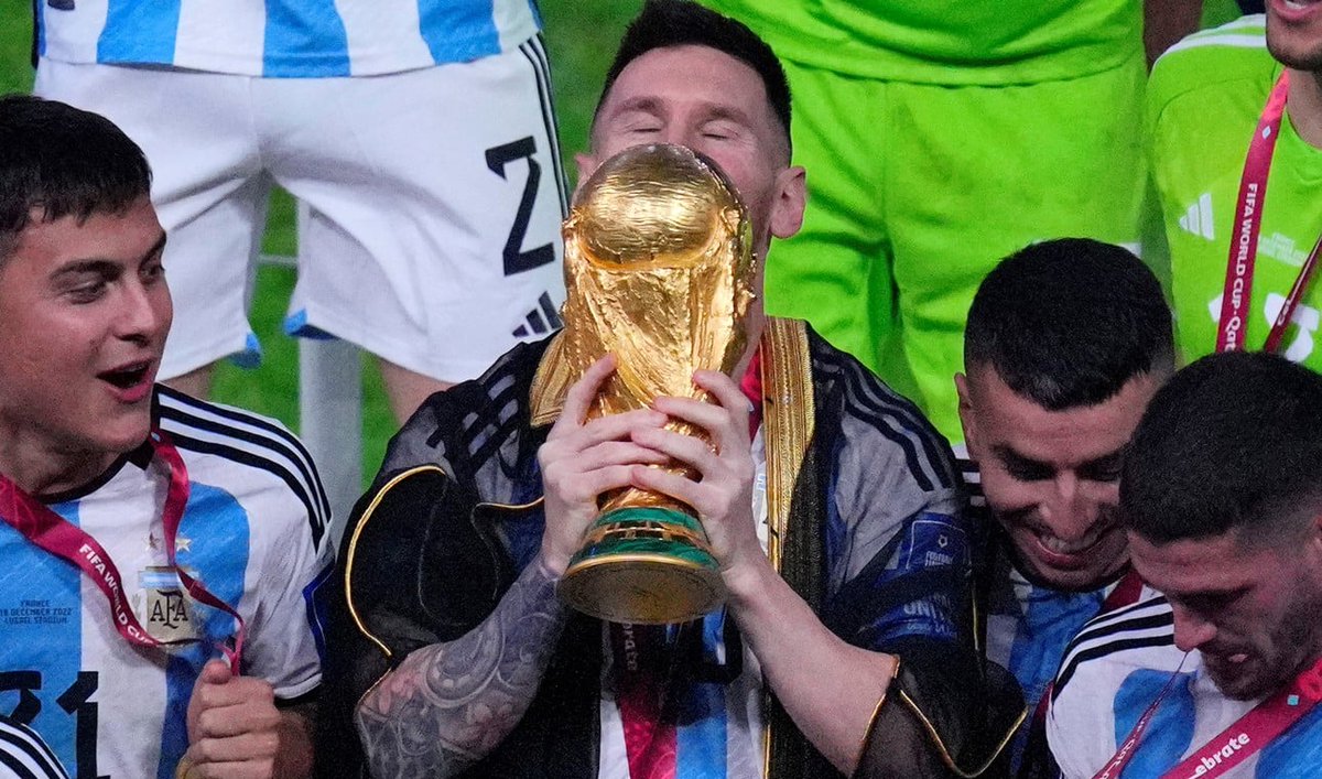 Messi🗣️: La vi ahí y no podía no hacer lo q hice. La Copa me llamaba. Me decía 'Ya está, vení y agarrame q ahora sí la podés tocar'. La veía ahí q brillaba, q sobresaltaba en ese estadio hermoso y no lo pensé, la fui a besar pq pasé por al lado. Lo necesitaba