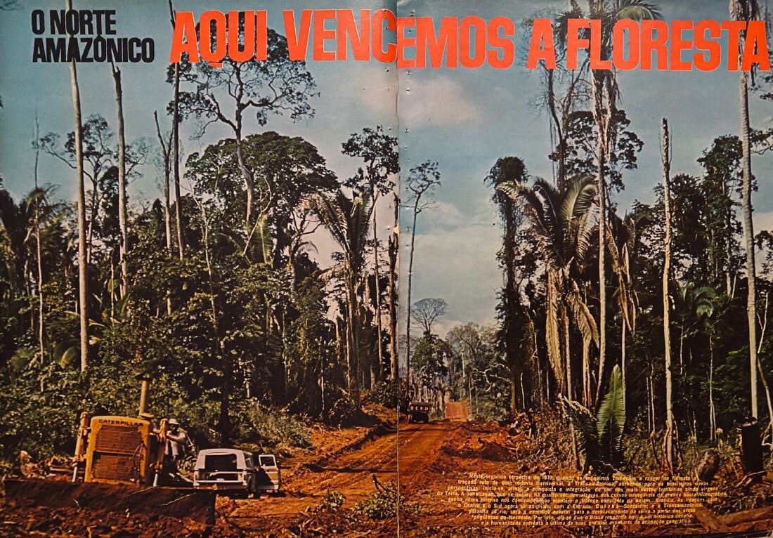 Edição especial da revista Manchete lançada em outubro de 1970 com 12 páginas coloridas dedicadas à "conquista" da floresta viabilizada pela abertura da rodovia Transamazônica, sob o sugestivo título de "Aqui vencemos a floresta". 8/21