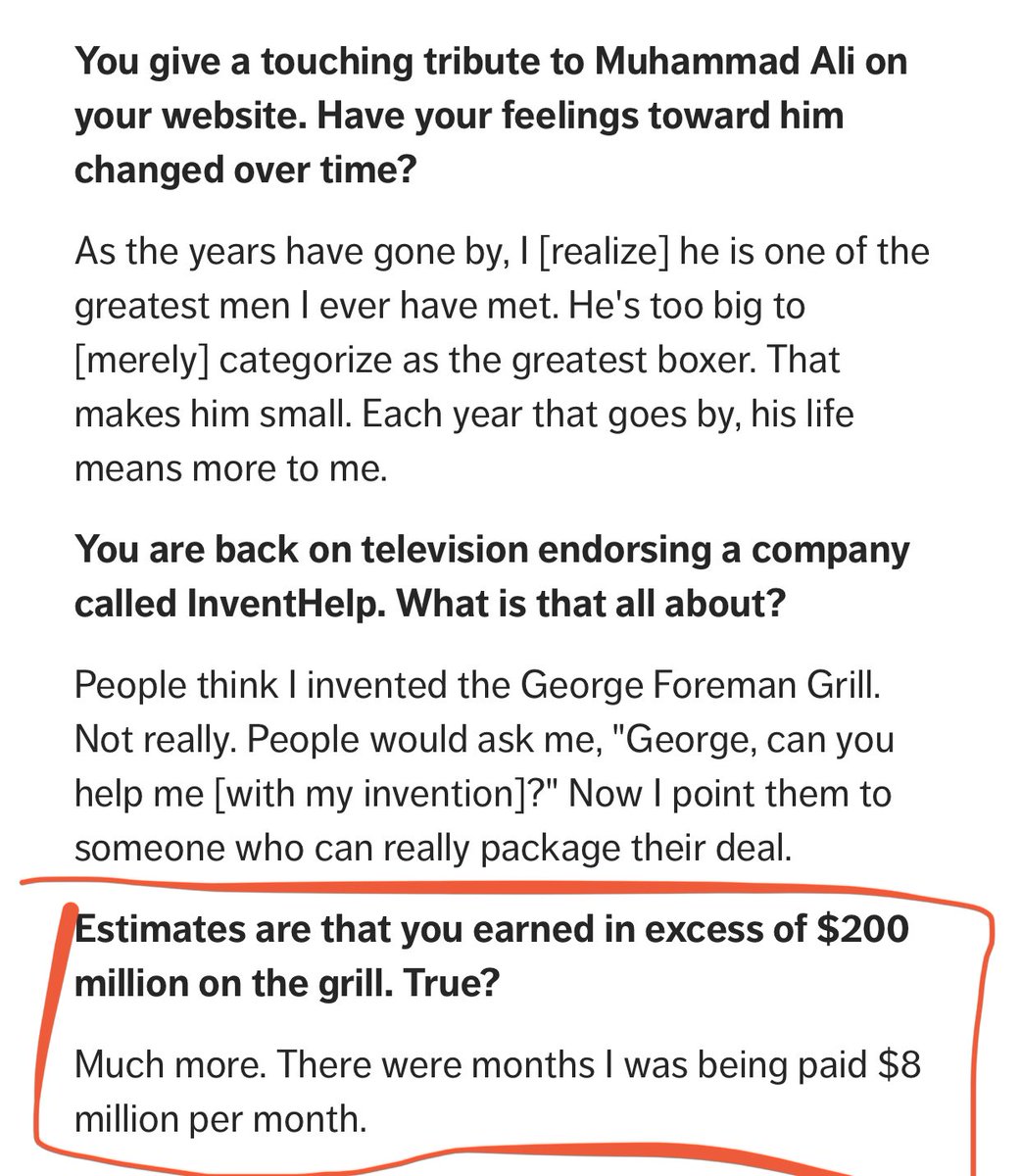 Foreman told AARP he made “much more” than $200m all-in on the Grill (he also shares thoughts on Muhammad Ali, who beat him 1974’s Rumble in the Jungle aka one of the greatest sporting events of 20th century). aarp.org