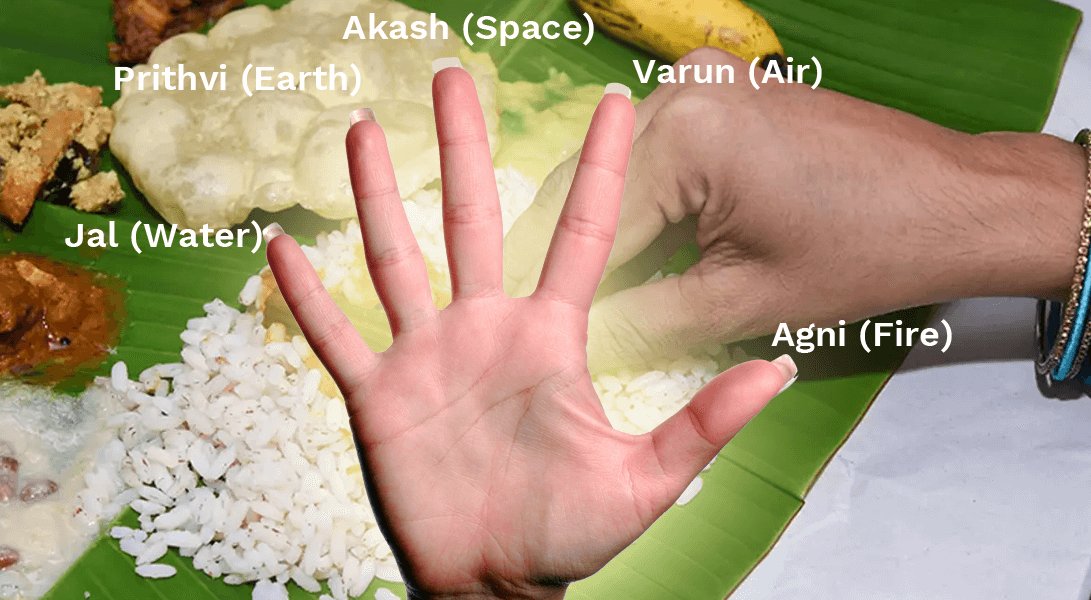 transformation of food before it passes on for internal digestion. Gathering the fingertips, particularly while eating rice the native and staple food of ancient India as they touch the food, it stimulates the five elements and invites the jatharagni or the fire in our