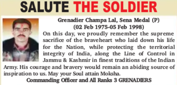Grenadier Champa Lal, Sena Medal (Posth)