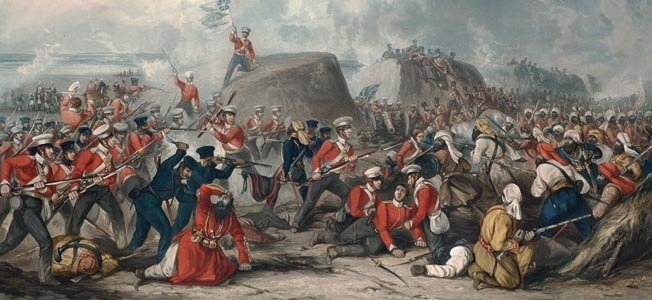 Mounted on his sturdy white horse, Sham Singh spurred forward at the head of his Khalsa contingent, into the ranks of the 50th Regiment of the British army facing him.